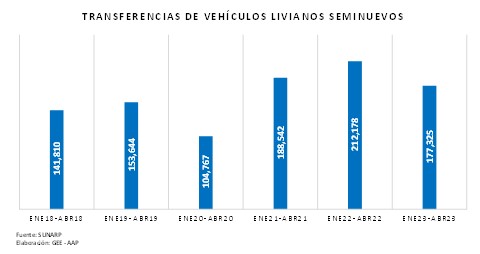 Al término de los primeros cuatro meses del 2023, la venta de vehículos seminuevos livianos reportó 177,325 unidades, cifra que significó un retroceso de 16.4% respecto a similar periodo del 2022, pero un 15.4% mayor a la cifra registrada en igual periodo del 2019, un año prepandemia. “El comportamiento de este segmento del mercado automotor responde a una mayor disponibilidad de vehículos nuevos, como consecuencia de las mejoras en la cadena global de suministros, y también al menor dinamismo del consumo privado, el comportamiento del empleo y al elevado nivel de precios en general”, sostuvo Alberto Morisaki, gerente de Estudios Económicos y Estadísticas de la Asociación Automotriz del Perú (AAP).