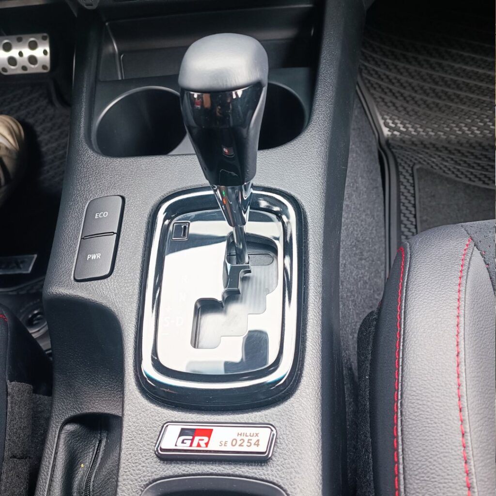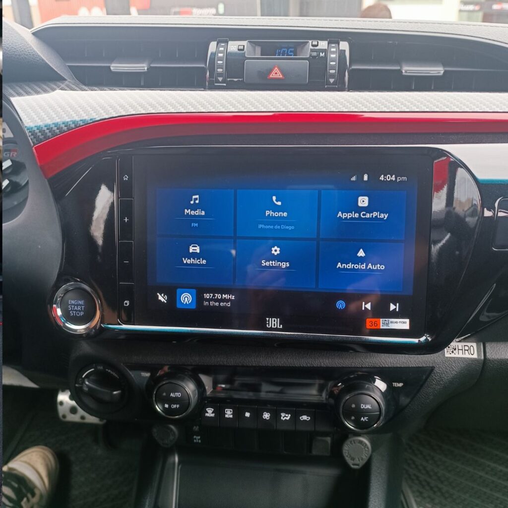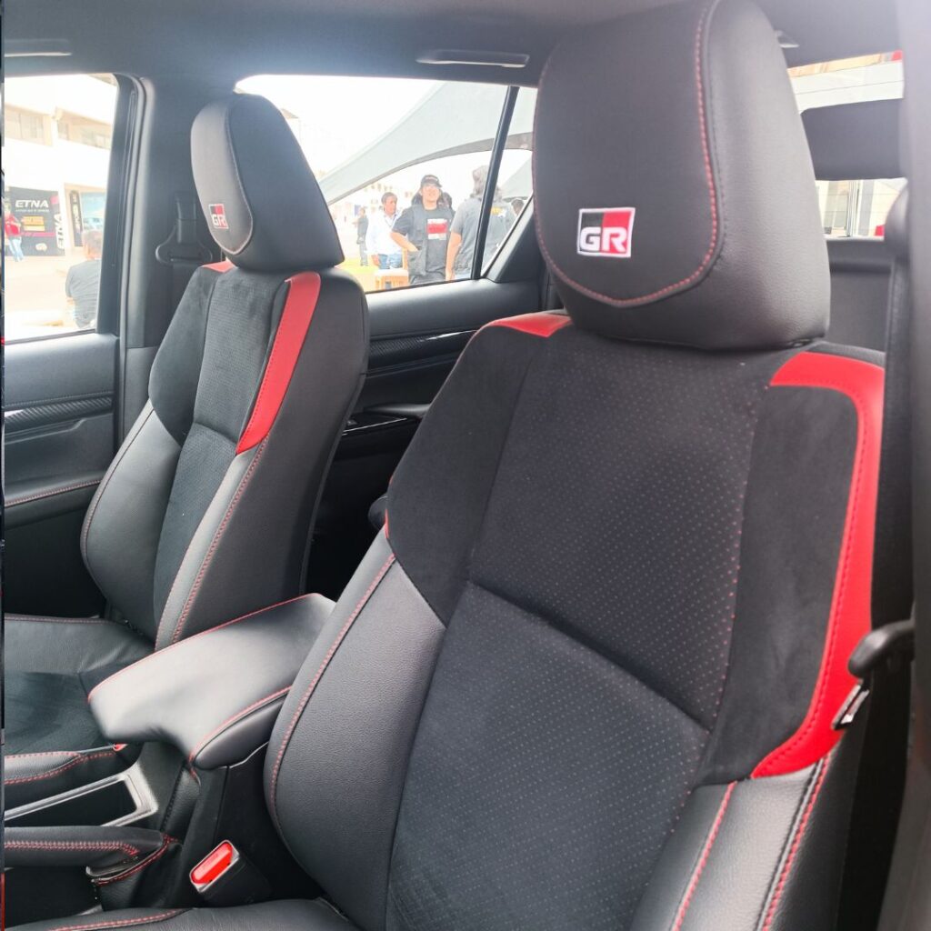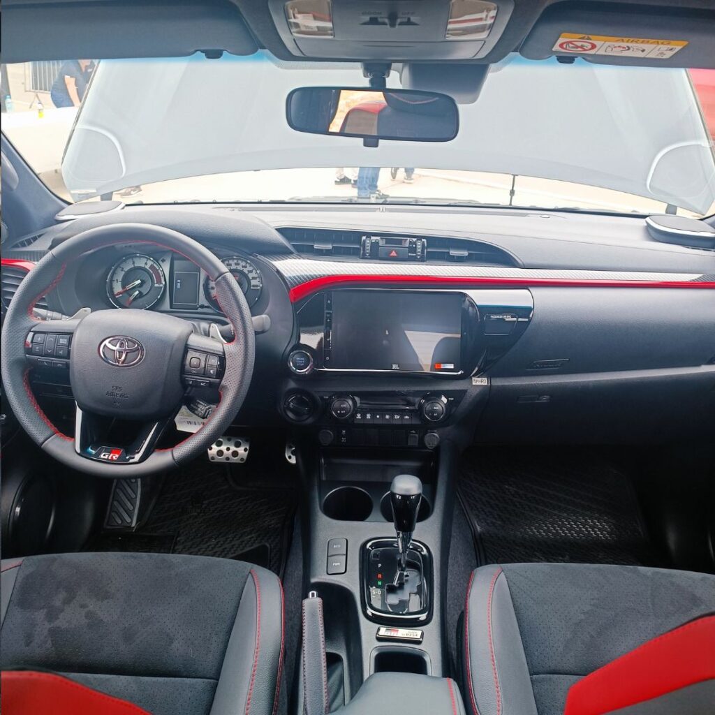 En cuanto al interior, la HILUX GR-Sport no escatima en confort y tecnología. Equipada con asientos eléctricos, un avanzado sistema de audio JBL con Android Auto y Apple CarPlay con conexión inalámbrica, conectividad Bluetooth, panel multi-información, timón de cuero y pedales deportivos, lo que proporciona un ambiente sofisticado. Además, su tapizado combina cuero natural y ecológico con tela perforada y detalles en rojo, completando su imagen vanguardista.
