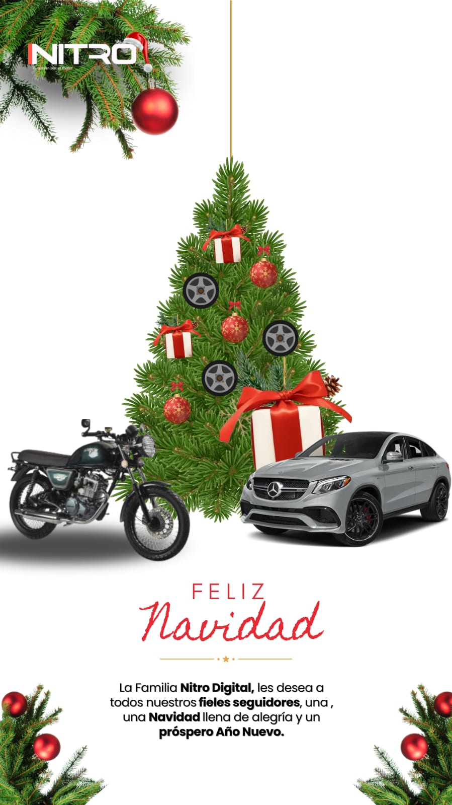 La familia de Nitro Digital que dirige Giovanna Alvarado, periodista, influencer y jurado para Perú del Women’s World Car of the Year, desea a todos sus clientes, seguidores y amantes de los autos que pasen una feliz Navidad en compañía de sus seres queridos.