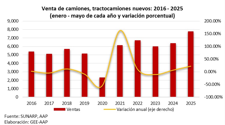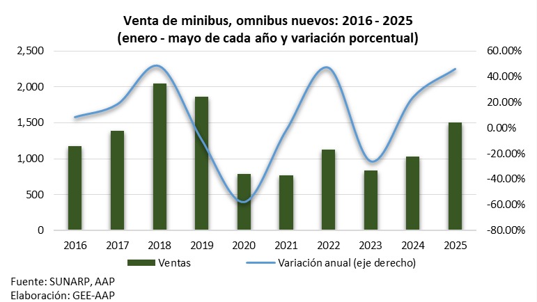 En tanto, el segmento de minibuses y ómnibus nuevos mantuvo su tendencia de fuerte expansión. “Durante mayo se vendieron 327 unidades, un incremento de 44.1% en comparación con igual mes del 2024. En los cinco primeros meses del año, se colocaron 1,506 unidades, creciendo 45.9% en comparación al mismo lapso del año anterior”, afirmó el vocero de la AAP. Este resultado responde, dijo, a la recuperación de sectores como transporte, turismo y entretenimiento, los cuales sufrieron shocks negativos y que se vienen desenvolviendo sin contratiempos desde hace dos años, de la mano de un mayor dinamismo en la inversión.