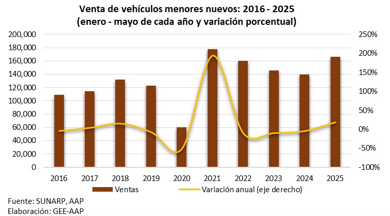 Por su parte, las ventas de vehículos menores también mostraron una expansión significativa. “En mayo se vendieron 35,428 unidades, lo que representa un crecimiento de 19.7% en comparación al mismo mes del año anterior. Entre enero y mayo, se comercializaron 166,025 unidades, un 19% frente a igual periodo del 2024”, señaló Morisaki. De ese total, 116,259 fueron motos (+18.7%) y 49,766 trimotos (+19.8%).