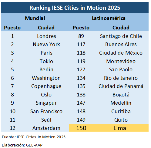 Capital peruana retrocede al puesto 150 de 183 ciudades evaluadas en el índice Cities in Motion 2025 del IESE.