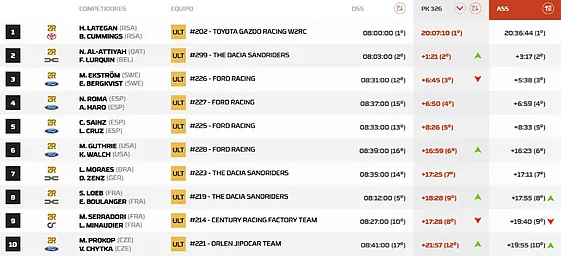 La clasificación general es liderada por Henk Lategan y Nasser Al-Attiyah, en una lucha que promete mantenerse ajustada en las próximas etapas.