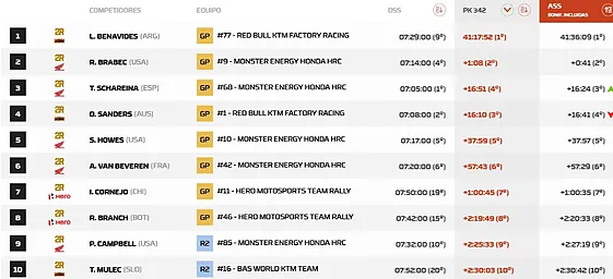 Benavides queda así como el principal contendiente directo de Brabec en la recta final del Dakar 2026.