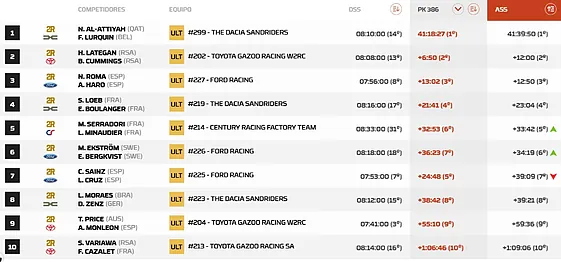 En la categoría de autos, la Etapa 10 marcó un antes y un después. Nasser Al-Attiyah dio un golpe decisivo en la general, ampliando su ventaja y dejando prácticamente sin opciones a Nani Roma y Carlos Sainz, que perdieron tiempo clave en una jornada donde la regularidad y la estrategia fueron determinantes.